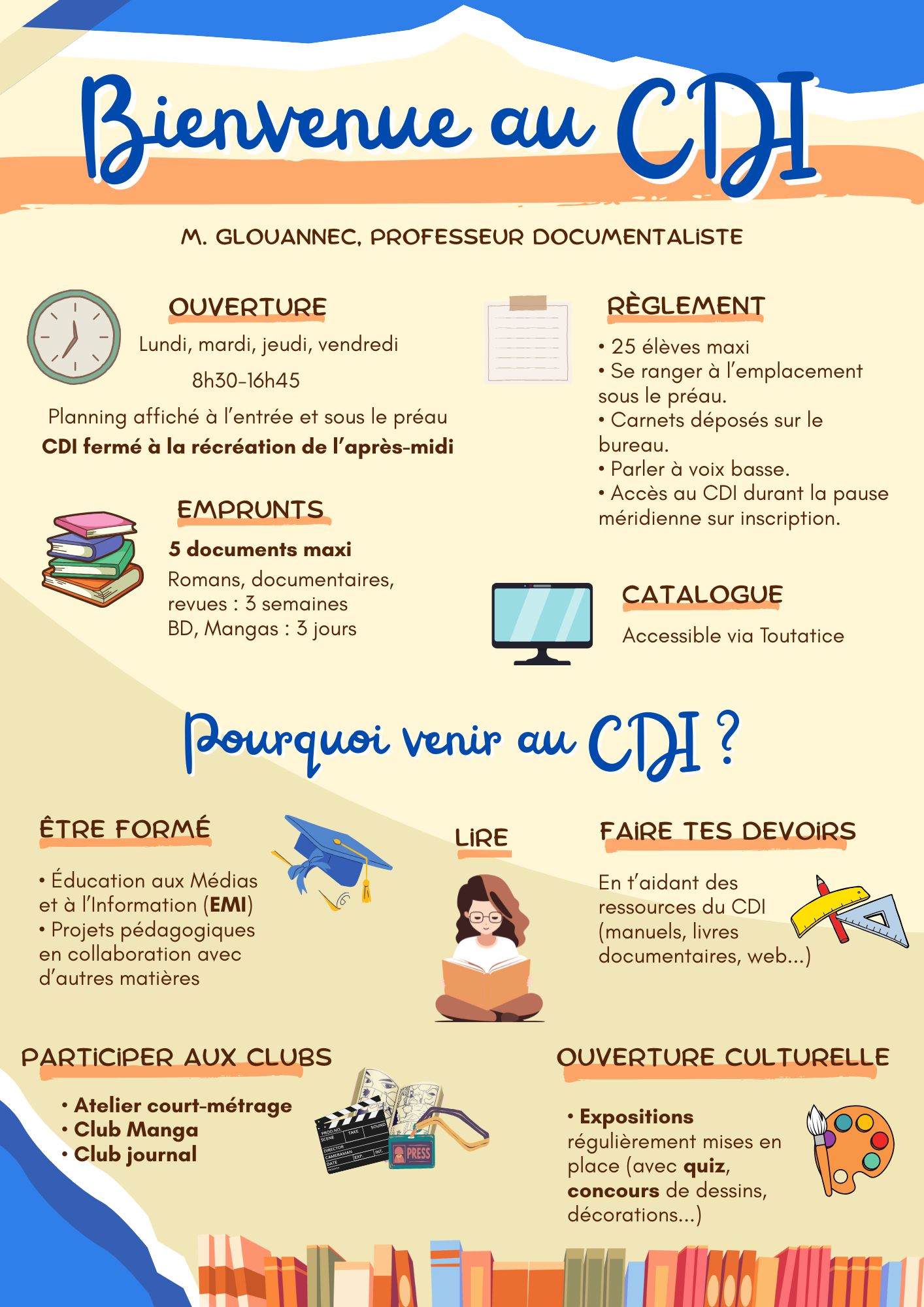 Le CDI est un espace de lecture, un lieu de ressources, de formation à l’EMI (Éducation aux Médias et à l’Information), d’ouverture culturelle.