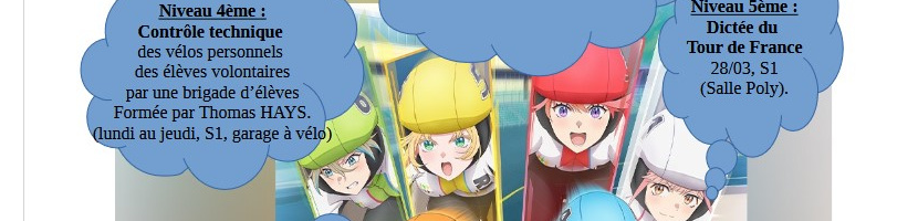 Dans moins de 48 heures, ce sera le lancement de la semaine du vélo au collège. Dans le cadre de notre engagement en faveur de la mobilité douce et de l’éducation à la sécurité routière, les équipes de la Vie scolaire et d’EPS du collège organise la Semaine du cyclisme, qui se déroulera du (…)